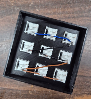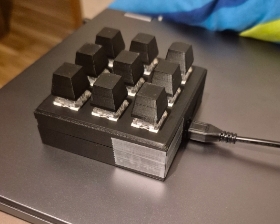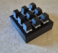 The completed keyboard that allows 9 unique keyboard inputs. Currently each key outputs Right Control + Numpad 1-9.